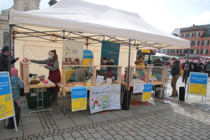 Ludwigsburg.| Der Kuchen-, Suppen- und Grußkartenverkaufsstand der beruflichen Schulen in Ludwigsburg am vergangenen Samstag auf dem Ludwigsburger Wochenmarkt zugunsten der Ukraine-Hilfe der „Aktion Deutschland Hilft“ war ein voller Erfolg: mehr als 2500 € für Menschen, die durch den Krieg in der Ukraine in Not geraten sind, wurden erzielt.
