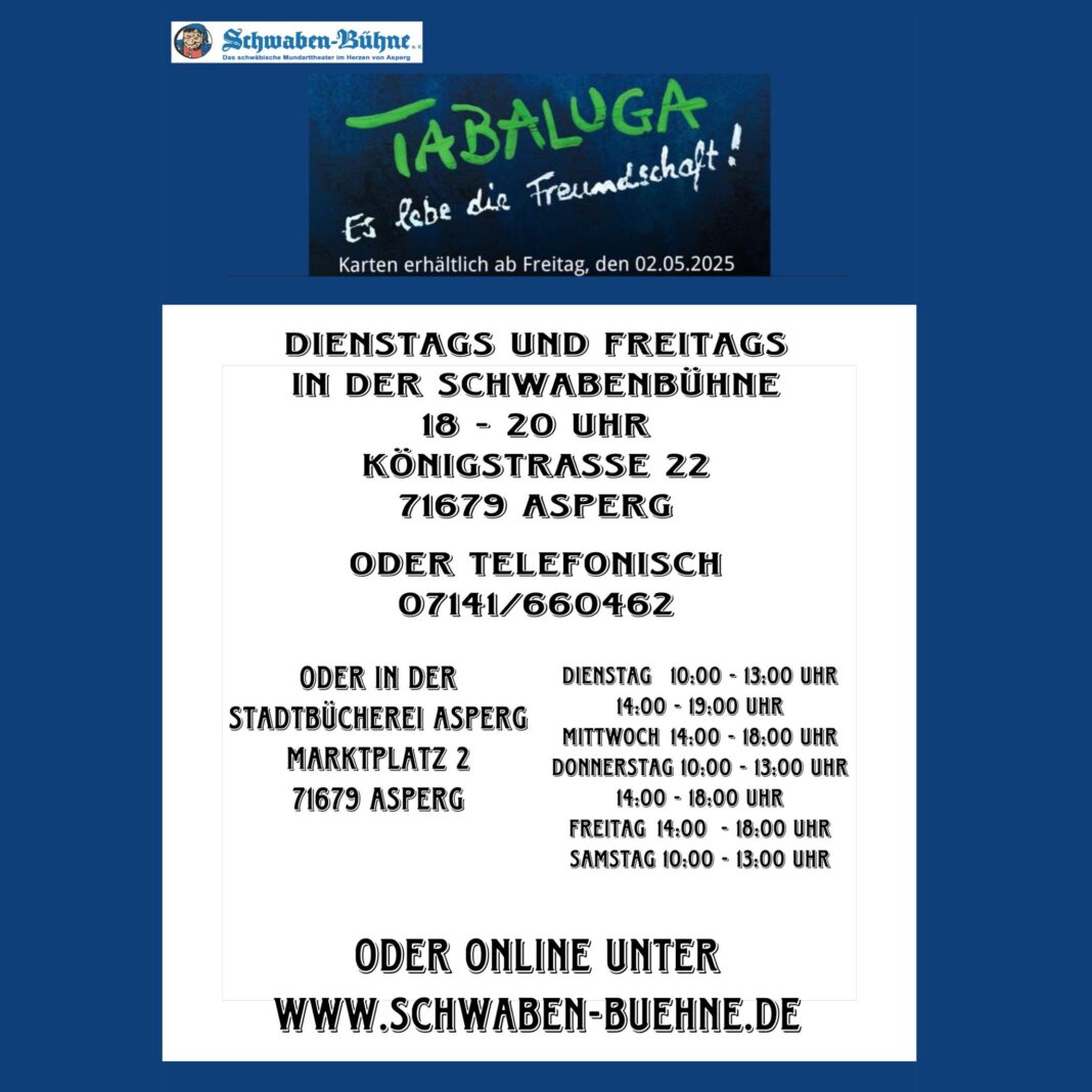 Der Kartenvorverkauf startet am 2. Mai 2025. Eintrittskarten sind erhältlich bei der Schwaben Bühne Asperg, in der Bücherei Asperg sowie online unter www.schwaben-buehne.de. Kinder bis 15 Jahre zahlen 10 €, Erwachsene 18 €.