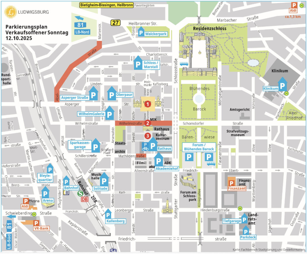 Wer mit dem Auto in die Stadt kommt, sollte dem Parkleitsystem folgen, um möglichst ohne Umwege und Wartezeiten einen freien Parkplatz zu finden. Auch das Parkhaus des RKH Klinikums Ludwigsburg ist mittlerweile an Wochenenden und Feiertagen in das städtische Parkleitsystem eingebunden. Für Autofahrende hat die Stadt einen Plan mit den innenstadtnahen Parkmöglichkeiten erstellt – dieser ist auch auf www.ludwigsburg.de und auf www.luis-ludwigsburg.de einsehbar. Ergänzend zu den vorhandenen dauerhaften Parkhäusern und Tiefgaragen hat die Stadt zusätzlich kostenlose Parkplätze eingerichtet. Diese sind bei den Aldi-Märkten in der Martin-Luther-Straße und der Marbacher Straße, an der VR-Bank in der Schwieberdinger Straße sowie beim Finanzamt in der Alt-Württemberg-Allee zu finden. An den zusätzlichen Parkplätzen sind auch Hinweise zum Busangebot für die Weiterfahrt angebracht.
