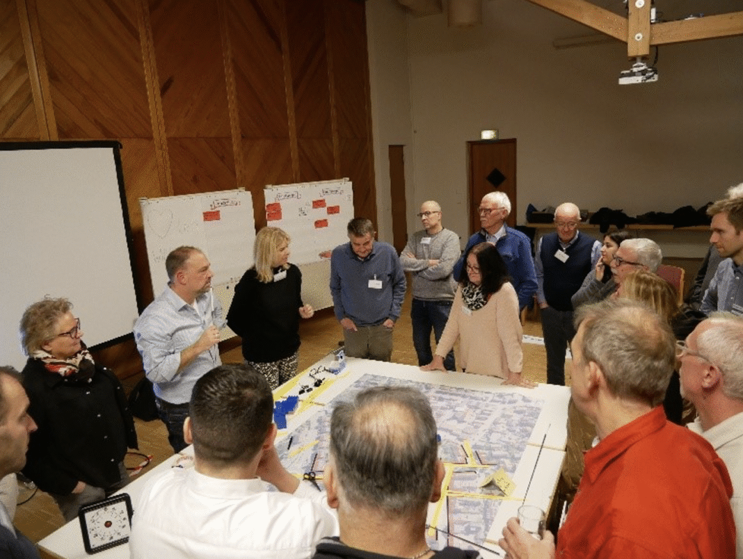 Nach dem umfangreichen Input waren nun die Mitglieder des Runden Tisches gefragt, in lockerer Arbeitsatmosphäre und interaktiv ins Gespräch zu kommen. An einem großen Plantisch in der Raummitte wurden beim Brainstorming erste Gedanken ausgetauscht, welche räumlichen Gestaltungsmöglichkeiten sich auf der gedanklich freien insgesamt rund 7.800 Quadratmetern großen Fläche bieten. In der sehr lebhaften Diskussion werden vielfältige Fragestellungen angetippt: Wo trifft man sich? Wie groß ist die künftige Platzfläche? Wie viel Grün passt in die Ortsmitte? Kann man ggf. die Verkehrsführung für den Autoverkehr ändern? Ist der Platz wie heute überfahrbar? Was ist mit dem Bus? Wo steht das Rathaus richtig? Wie könnte ein Angebot für besondere Wohnformen bzw. bezahlbaren Wohnraum in die Ortsmitte gut integriert werden? Losgelöst von der räumlichen Betrachtung wird nochmals deutlich: Das Rathaus soll weiterhin sichtbar die Ortsmitte markieren und identitätsstiftend für diese sein. Der Platz soll im Alltag lebendig und für alle ein Angebot sein und vielseitig nutzbar. Handel und Gastronomie sollen durch die Neugestaltung gestärkt werden.