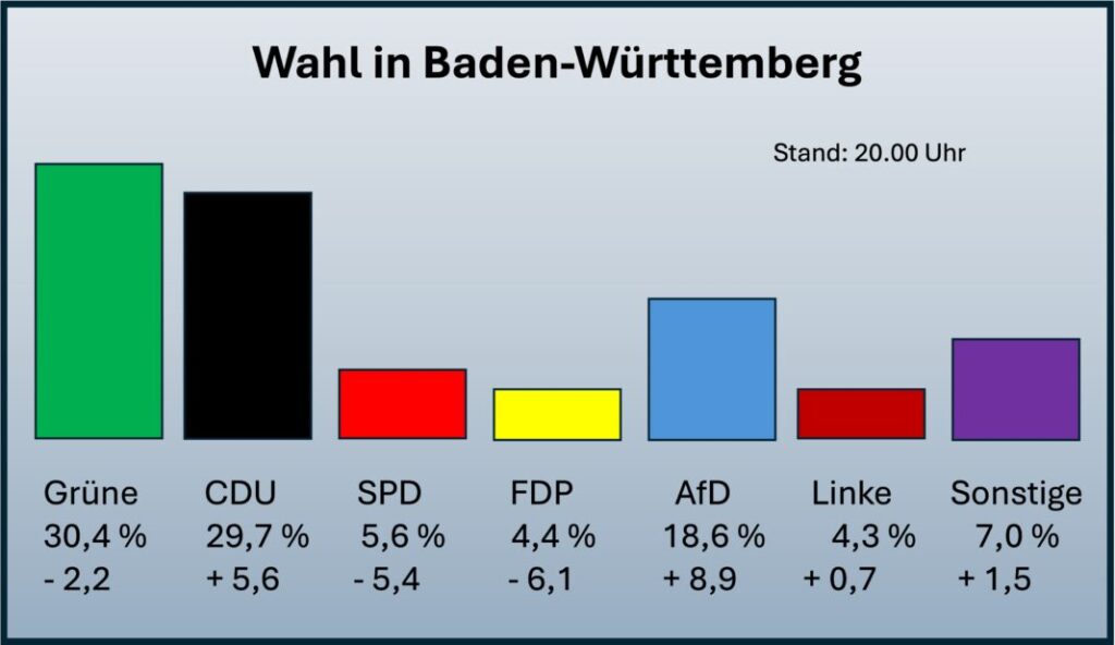 Grüne knappe Wahlsieger vor CDU. SPD mit massivsten Verlusten. FDP fliegen aus dem Landtag, Linke schafft’s nicht rein. Rülke tritt als Landeschef der FDP zurück.
