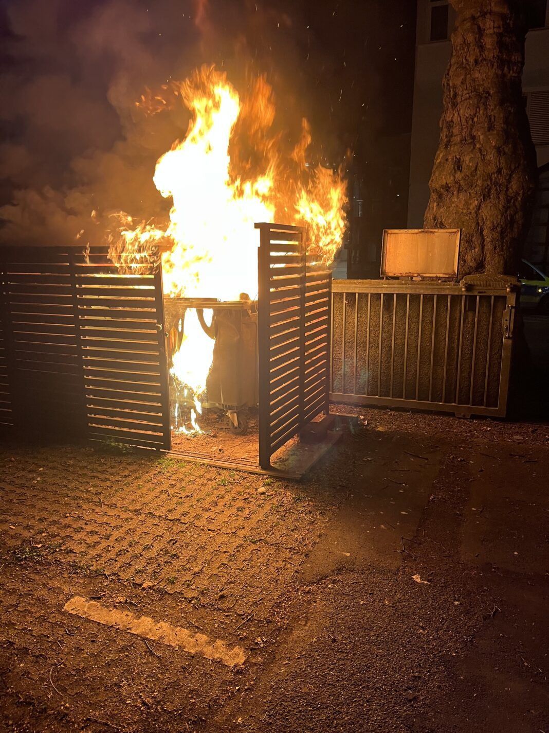 Um 00:13 Uhr wurde die Feuerwehr in die Karlstraße alarmiert. Auf einem gemeinsamen Parkplatzgelände zweier Schulen stand eine 1000-Liter-Mülltonne in voller Ausdehnung in Flammen. Eine hölzerne Mülltonnenbox wurde durch die Hitze in Mitleidenschaft gezogen. Ein Übergreifen der Flammen auf die Mülltonnenbox konnte durch das schnelle Eingreifen der Feuerwehr verhindert werden. Die Einsatzkräfte leiteten umgehend die Brandbekämpfung ein und nahmen hierzu ein Löschrohr vor. Die Mülltonne wurde im Anschluss auseinandergezogen und der betroffene Bereich mit einer Wärmebildkamera kontrolliert.