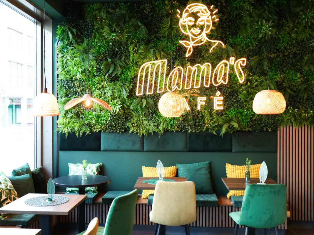 Der Standort im JägerhofQuartier wird über rund 50 Sitzplätze im Innenbereich sowie weitere 30 bis 40 Plätze im Außenbereich verfügen und ist barrierefrei zugänglich. Gestalterisch setzt Mamas Café auf eine warme, natürliche Atmosphäre mit Grüntönen, vielen Pflanzen und Liebe zum Detail. Familienfreundliche Aspekte wie Kinderstühle sind fest eingeplant, das Café soll ein beliebter Ort werden für Anlässe wie Babypartys.