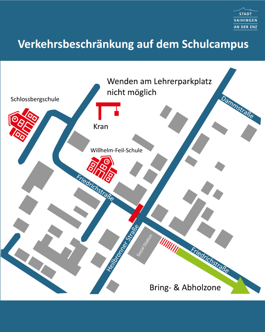 Vaihingen/Enz.| Wichtige Info für Eltern: Aufgrund von Sanierungsarbeiten an der Wilhelm-Feil-Schule kommt es an der Friedrichstraße zu Verkehrseinschränkungen. Die Einfahrt in Richtung Schulcampus ist nach den Ferien für mehrere Wochen nur eingeschränkt möglich, da auf dem dortigen Lehrerparkplatz ein Baukran aufgestellt wurde und dadurch die Wendemöglichkeit entfällt.