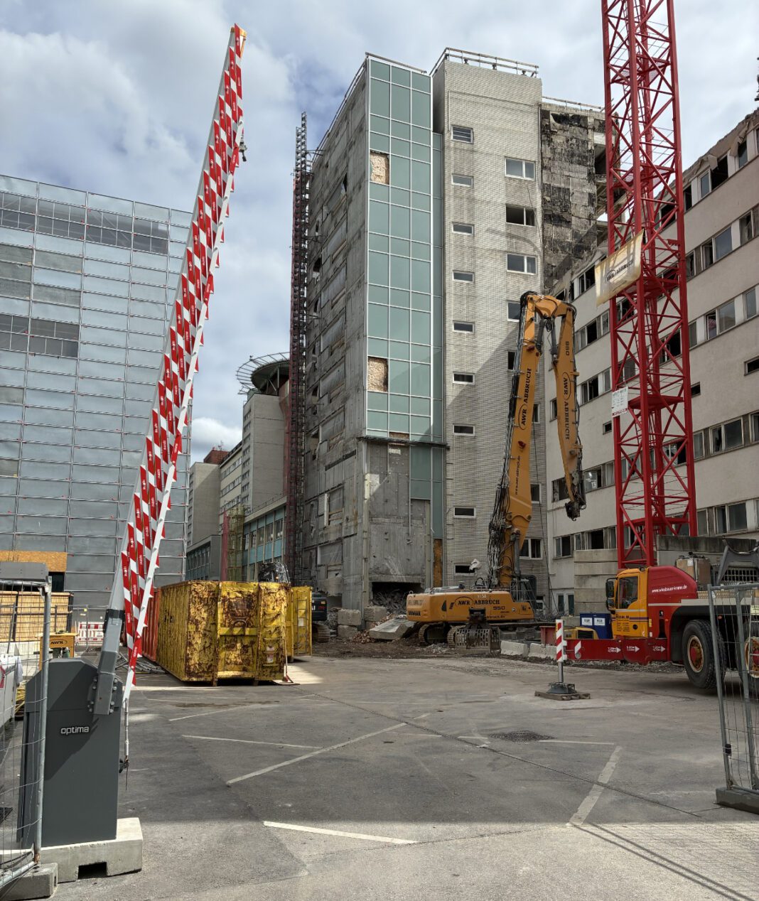 In Vorbereitung darauf wurde in den vergangenen Monaten ein achtstöckiges Hochhaus auf dem Klinikgelände rückgebaut. Bis Ende 2029 entstehen hier unter anderem eine neue, leistungsfähige Interdisziplinäre Notaufnahme (INA), in der künftig jährlich rund 40.000 Patientinnen und Patienten behandelt werden, sowie ein erweiterter, hochmoderner Zentral-OP.