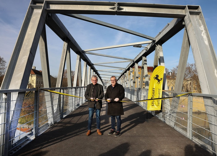Der Cannstatter Bezirksvorsteher Bernd-Marcel Löffler und der Leiter des Stuttgarter Tiefbauamts, Jürgen Mutz, haben am heutigen 12. Dezember die neue Behelfsbrücke über den Neckar nahe der Wilhelma freigegeben. Damit steht für den Fuß- und Radverkehr in Bad Cannstatt eine sichere und barrierefreie Querungsmöglichkeit zur Verfügung.