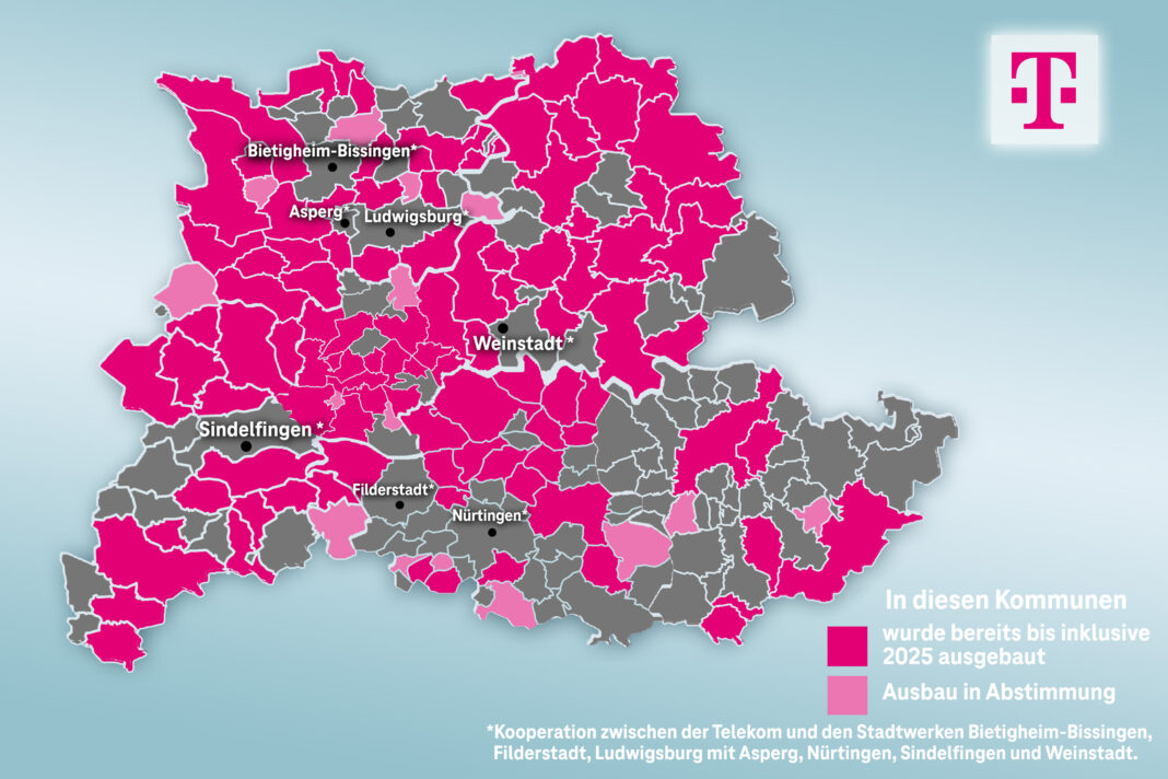In Filderstadt, Sindelfingen, Weinstadt, Bietigheim-Bissingen und Ludwigsburg nutzen mittlerweile zahlreiche Bürgerinnen und Bürger Glasfaseranschlüsse, die im Rahmen der Kooperationen mit den Stadtwerken entstanden sind. In Ludwigsburg ist der Glasfaserausbau weitestgehend abgeschlossen. In Asperg haben die Stadtwerke Ludwigsburg im Juni mit dem Glasfaserausbau begonnen. In Nürtingen haben die Stadtwerke Nürtingen und die Telekom beschlossen, ihre Kooperation auf das gesamte Stadtgebiet auszuweiten und dazu eine entsprechende Vereinbarung unterzeichnet.