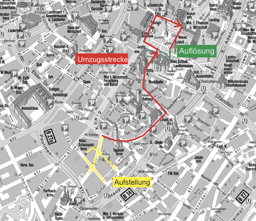 Die Aufstellung erfolgt auf der Tübinger Straße, der Sophienstraße und der Christophstraße. In diesen Straßenzügen sowie entlang der Umzugsstrecke stehen am Dienstag bereits ab 6 Uhr keine Halt- und Parkmöglichkeiten zur Verfügung. Die im Streckenverlauf entfallenden Schwerbehindertenparkplätze werden vorübergehend in die Kronprinzstraße ausgewiesen.